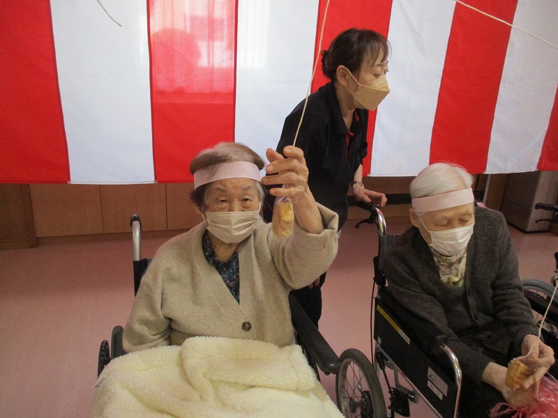 次の種目は、『玉入れ』です。職員が背負っているカゴを目がけて